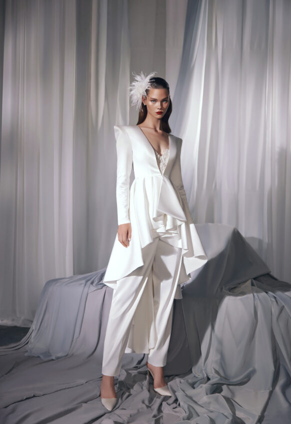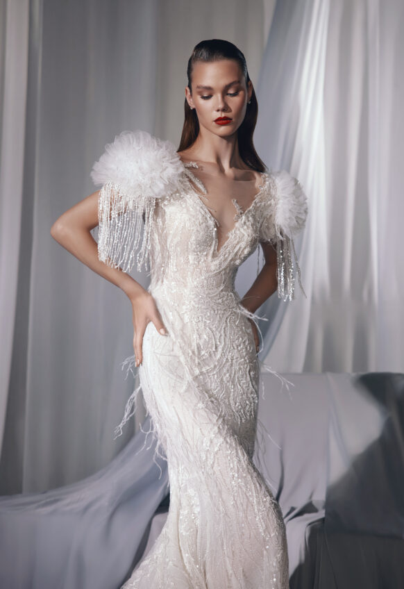 Feather, glitter tulle, lace with beads and sequins, stretch lycra