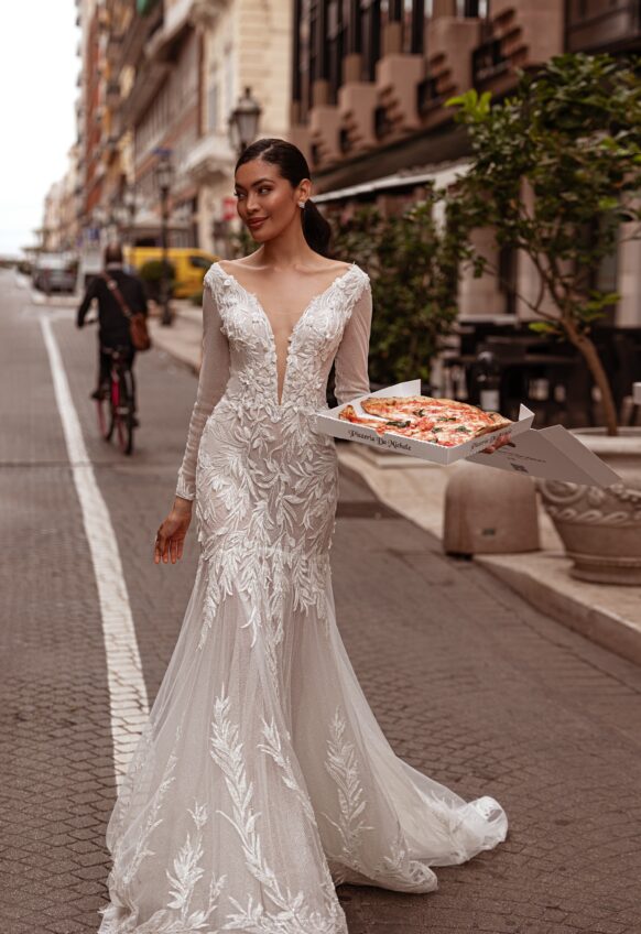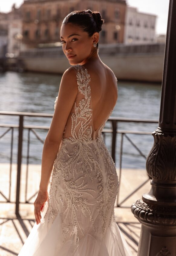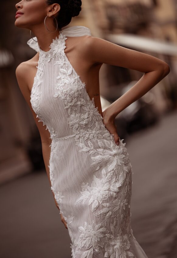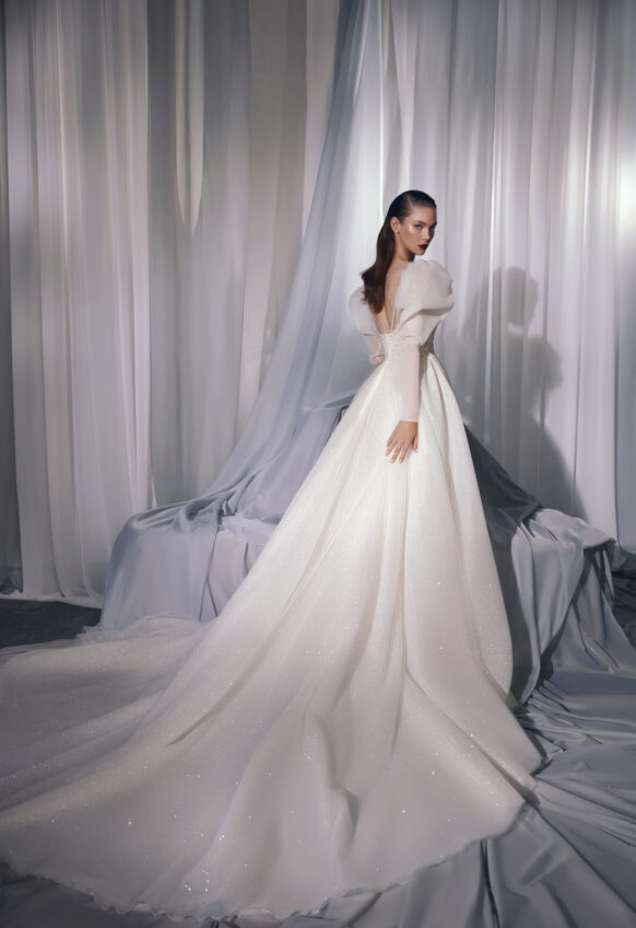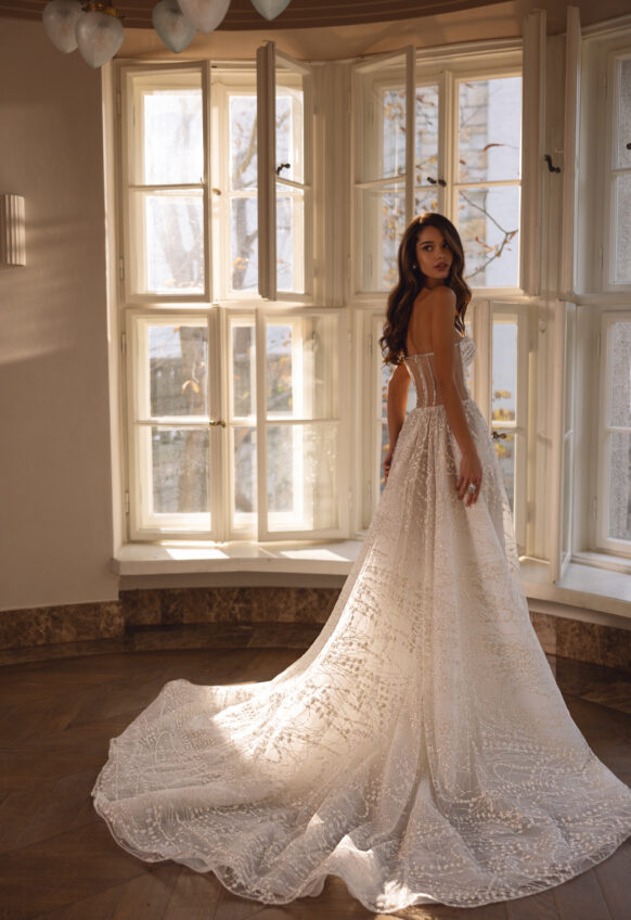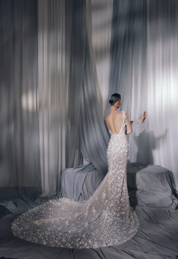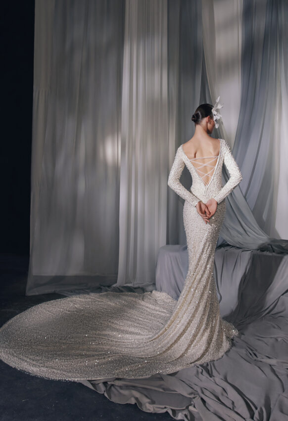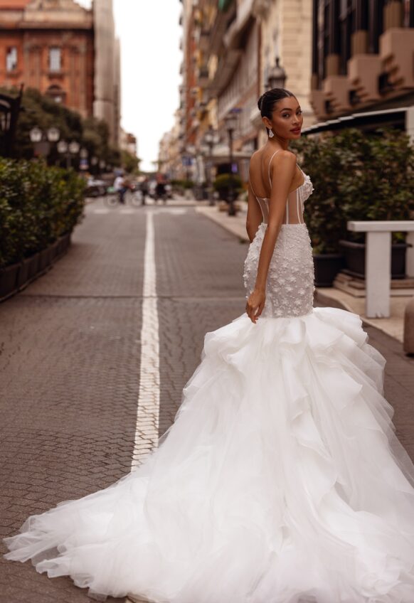 beads and sequins, glitter tulle, lace with 3D flowers