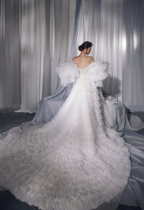 3D flowered lace, Feather, handmade beadings, handmade tulle flowers, veil mesh