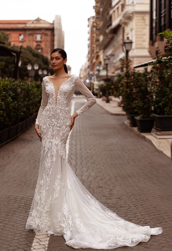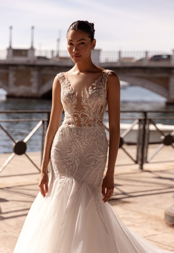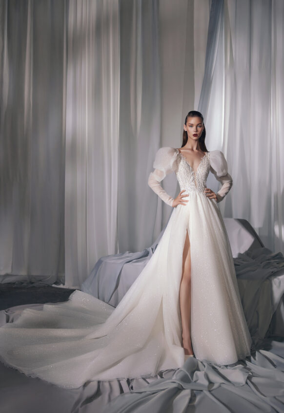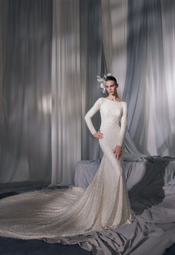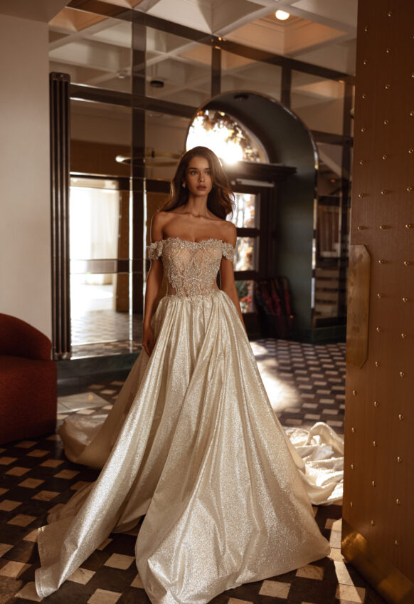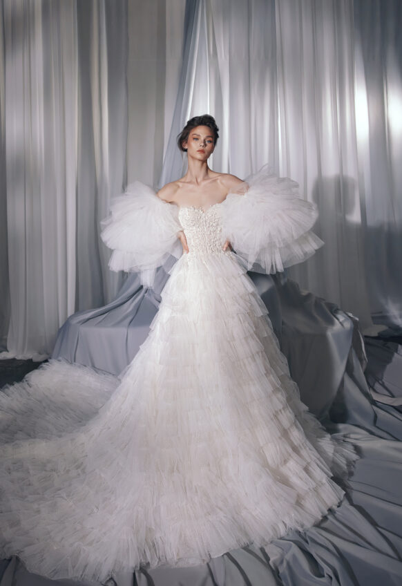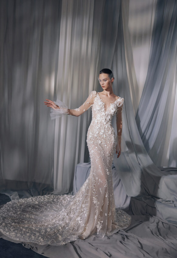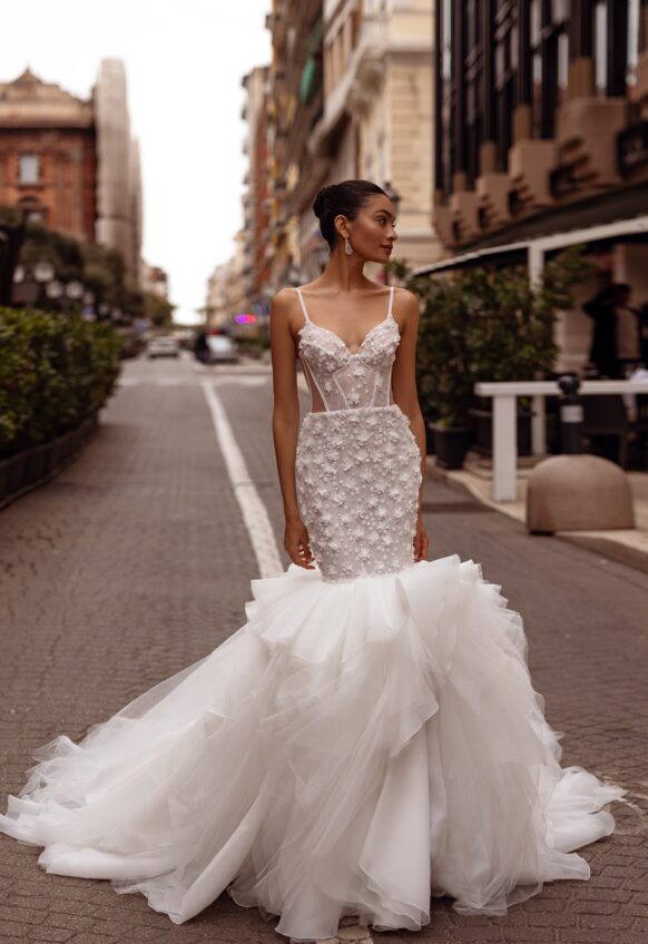 beads and sequins, glitter tulle, lace with 3D flowers