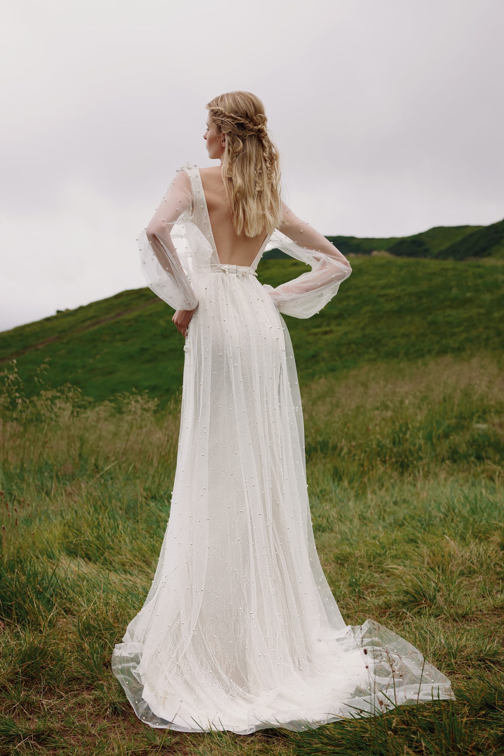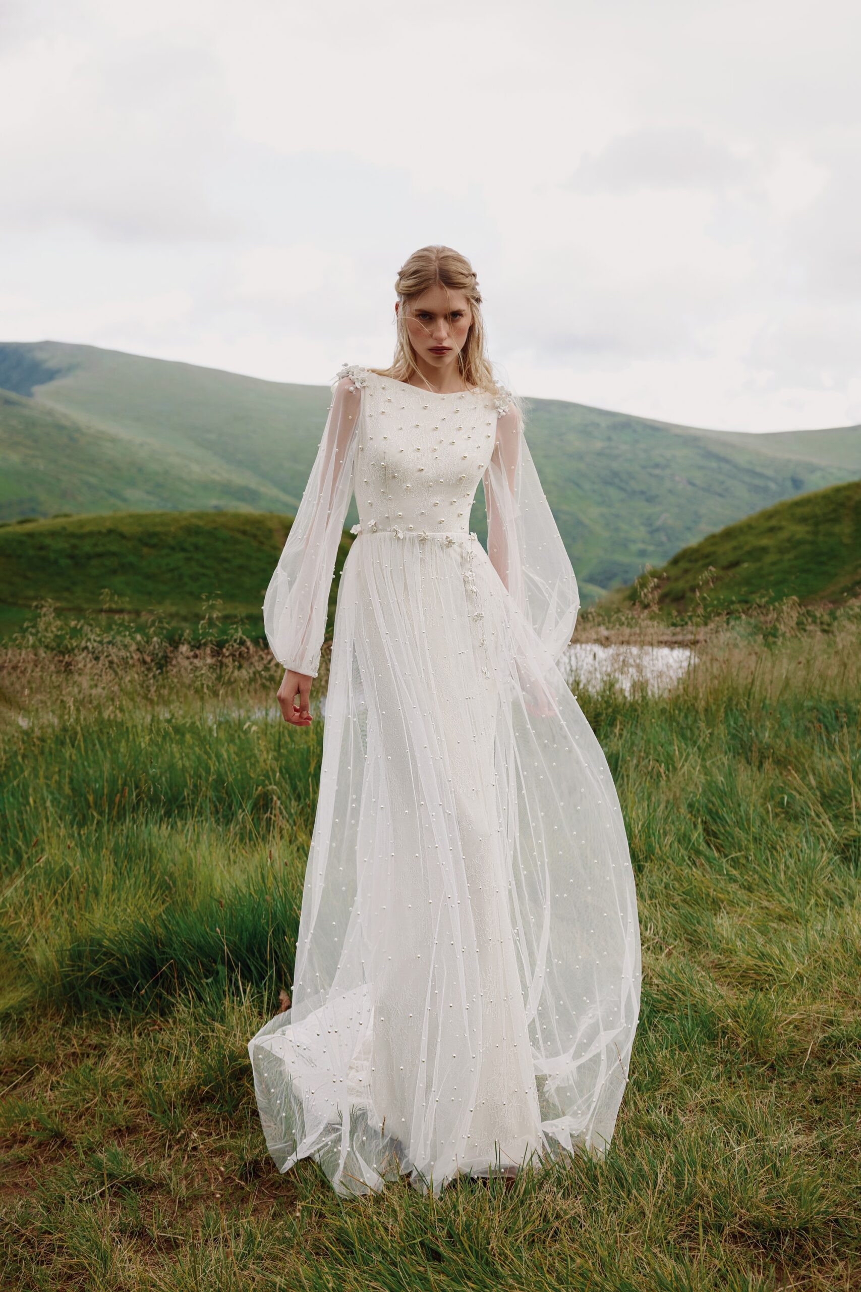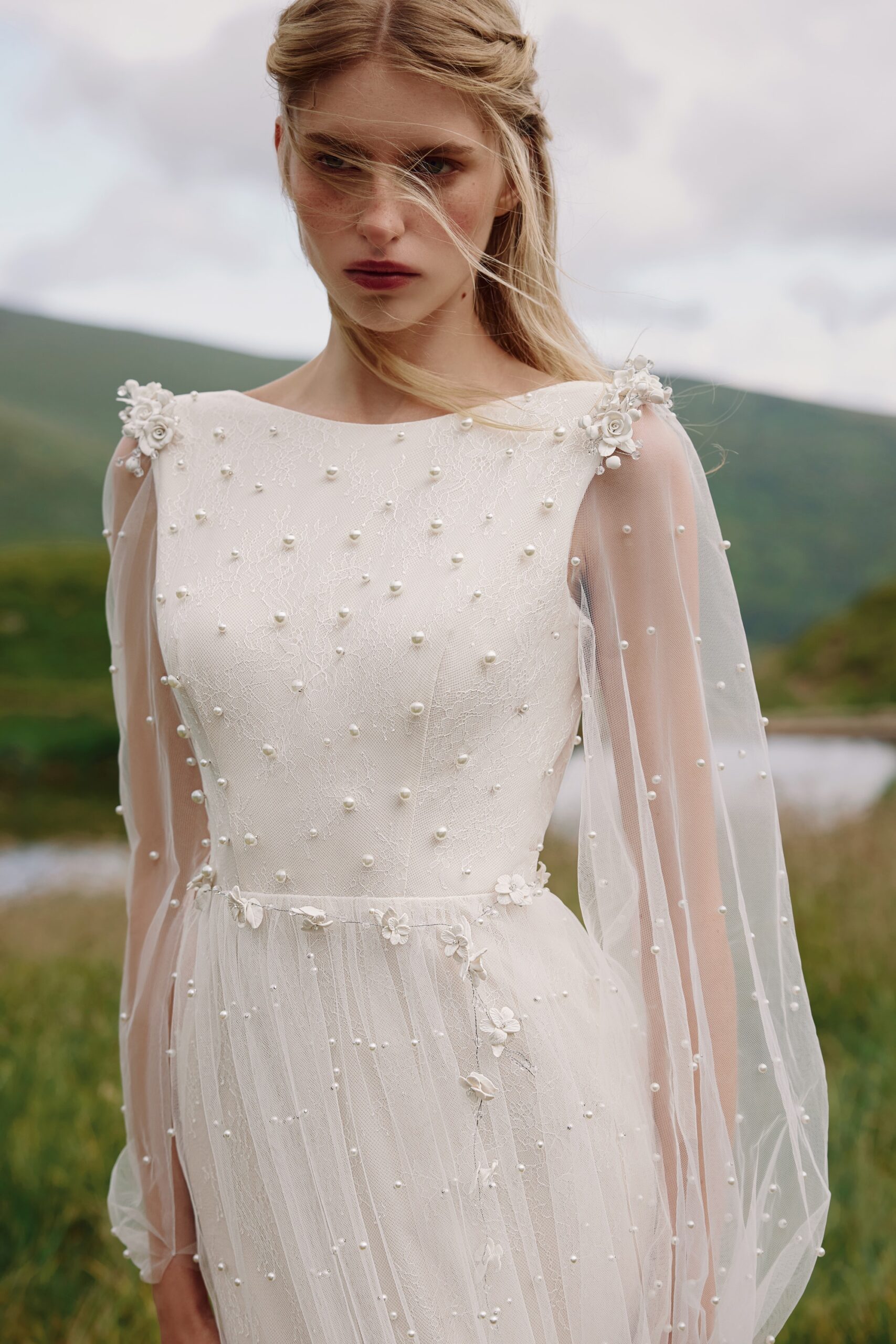 3 pcs - on shoulders and belt, chantilly lace, handmade ceramic flowers, tulle with pearls