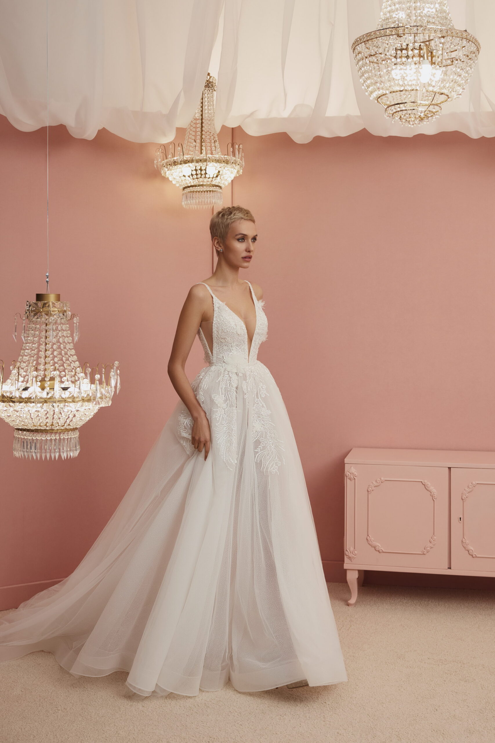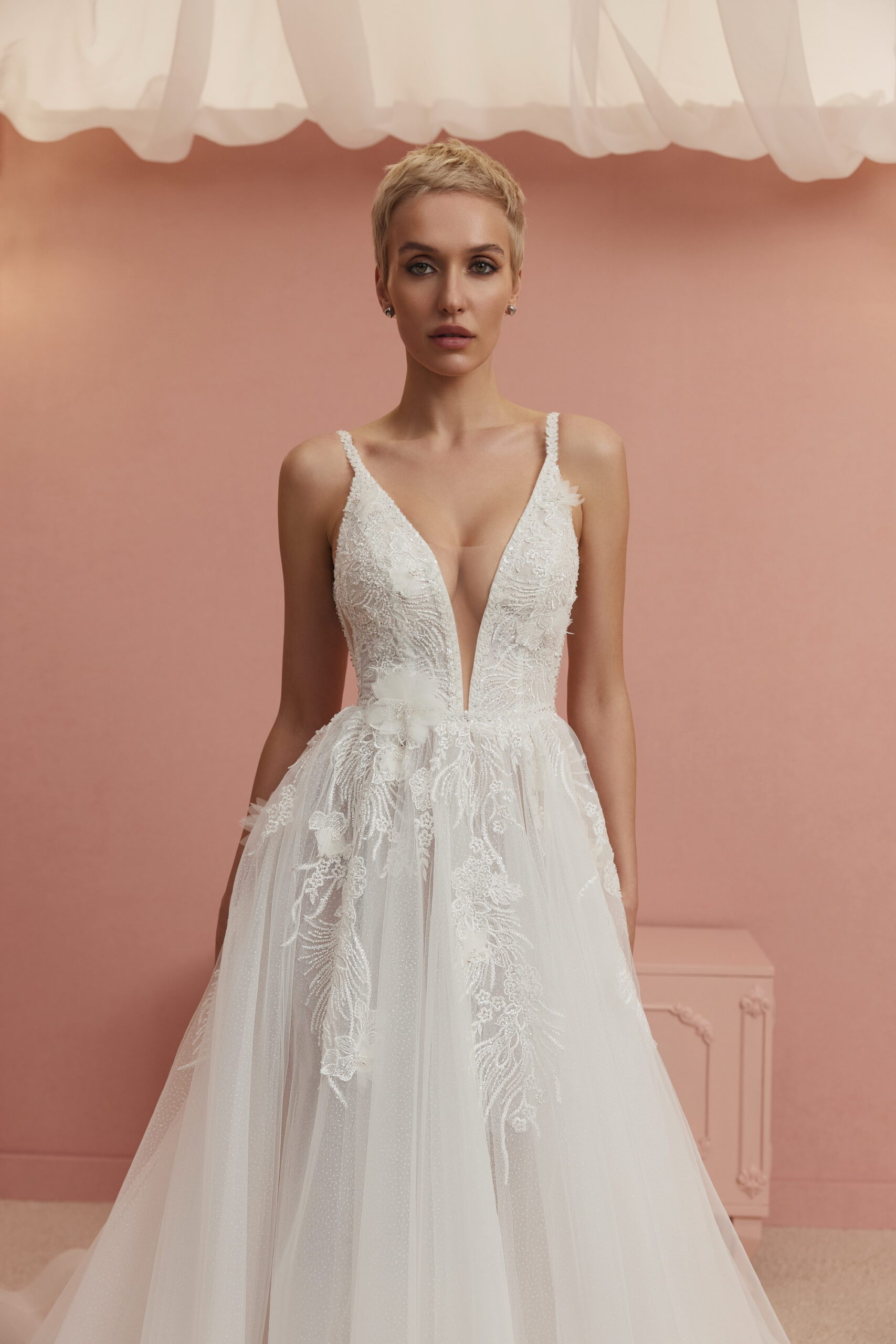 3D flowered lace with beads and sequins, dotted glittered tulle, lining